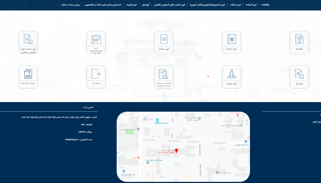 آدرس: جمهوری اسلامی ایران، تهران، میدان امام خمینی (ره) -خیابان امام خمینی (ره) – وزارت امور خارجه